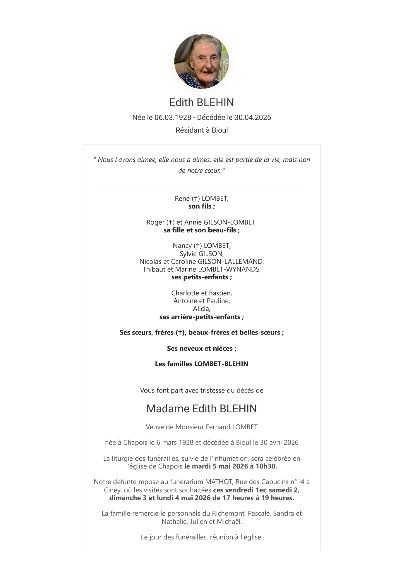 Avis de décès de Madame Edith BLEHIN