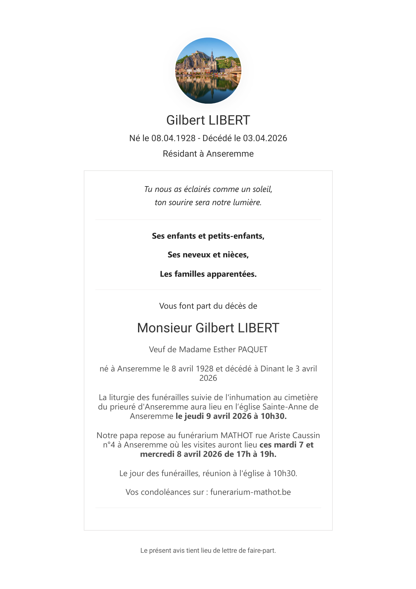 Décédé à Dinant (5500) le vendredi 3 avril 2026 à l'âge de 97 ans